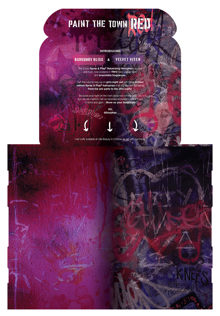 “What’s Your Vibe” celebrated the launch of SexyHair’s limited-edition Spray & Play cans, featuring two new scents: Burgundy Bliss and Velvet Vixen. With bold, graffiti-inspired visuals and a modern grunge aesthetic, this campaign brought a rebellious edge to SexyHair’s signature styling line, blending fragrance, fashion, and attitude into one expressive moment.